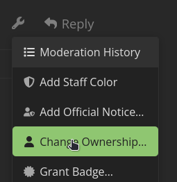 Go to the topic and find the “more” icon. Click it to see additional options, then click the wrench. From there, you can select “change ownership”.